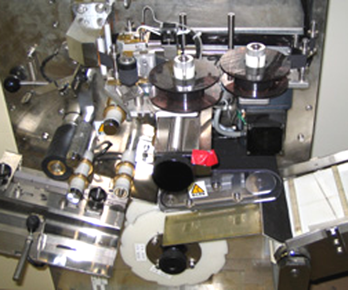 対象品をスターホイールでフィードし、ラベルはエアードラムで吸着しています。